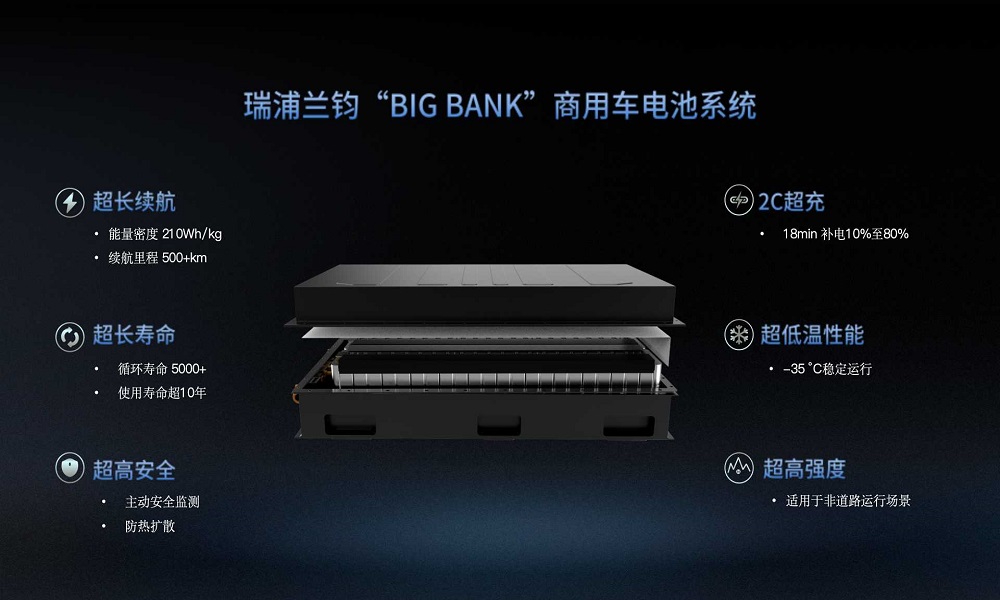 瑞浦兰钧“BIG BANK”商用车电池系统能量密度超过210Wh/kg,主推500kWh系统可支持重卡车型续航里程突破500km。除了超长续航外,瑞浦兰钧“BIG BANK”商用车电池系统在快充、安全、低温性能以及循环寿命等方面都具备突出表现。该系统具备2C快充性能,18min可实现10%-80%快速补电,有效提升运营效率;具备主动安全监测功能,并可防止热失控蔓延;在先进的热管理技术赋能下,可实现-35℃稳定运行;循环寿命高达5000次以上,使用寿命超10年。