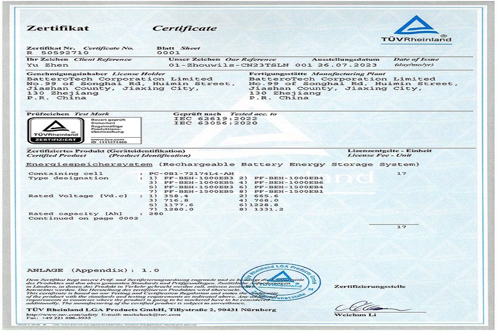 近日,兰钧新能源科技有限公司280Ah风冷插箱、电池簇1000V/1500V双平台储能系统均通过了德国莱茵TÜV Rheinland颁发的IEC 62619、IEC 63056、IEC 62477、IEC 61000、IEC 60730五项国际权威报告及认证,以及UL 1973、UL 9540A两项美标权威认证,这标志着兰钧新能源风冷电池插箱及电池簇在安全性能上已经达到国际标准要求,获得了通往国际市场的通行证。除此之外,该产品也同步取得海关颁发的UN38.3测试报告及配套的运输鉴定,以满足出口运输安全。
