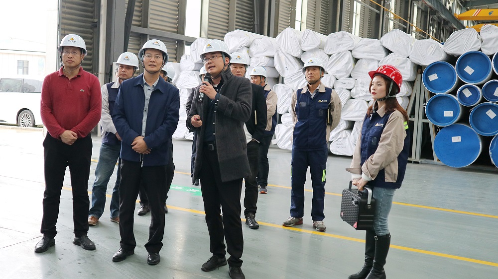 柳公立一行前往公司焊管车间和管件车间参观考察时,蔡勇强等领导详细介绍了企业发展历程、工艺流程、产品原材料、设备配置和生产经营等方面的情况。